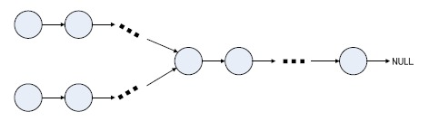 所以,先遍历第一个链表,记住最后一个节点。然后遍历第二个链表,到最后一个节点时和第一个链表的最后一个节点做比较,如果相同,则相交,否则,不相交。这样我们就得 到了一个时间复杂度,它为O((Length(h1) + Length(h2)),而且只用了一个额外的指针来存储最后一个节点。这个方法时间复杂度为线性O(N),空间复杂度为O(1),显然比解法三更胜一筹。